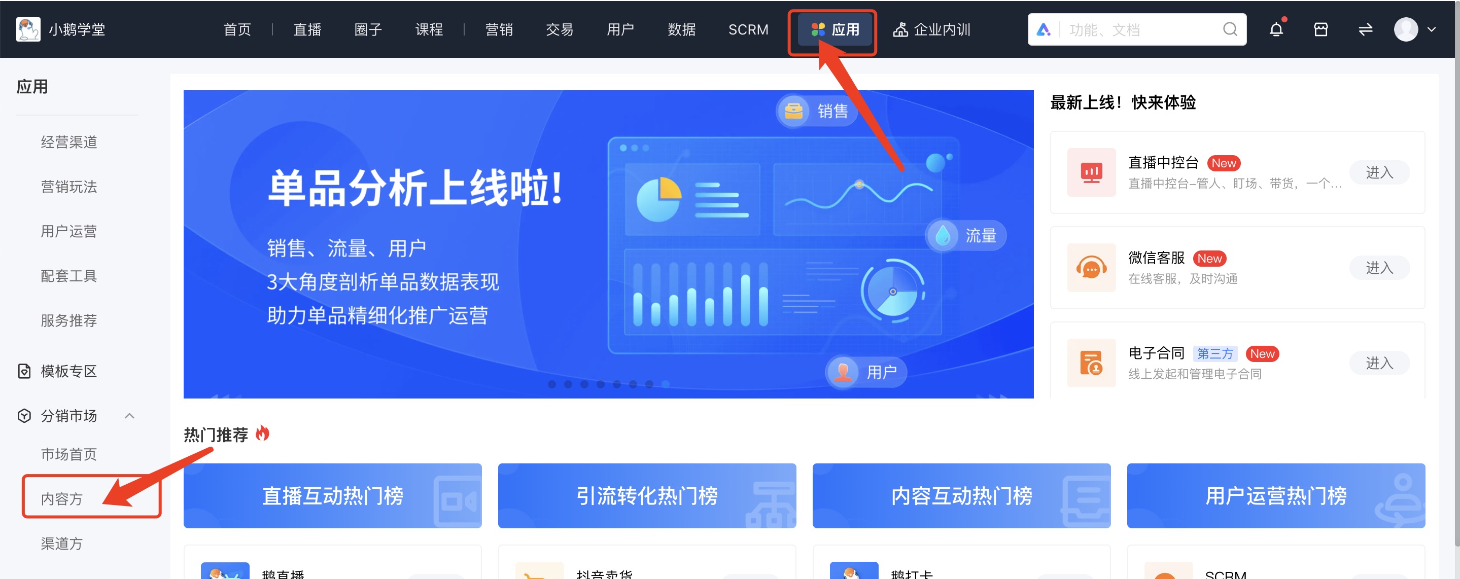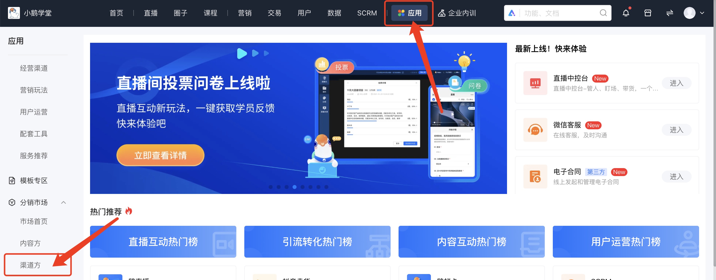 1. 登陆小鹅通管理台,点击顶端【应用】,可以看到左侧【分销市场-市场首页】