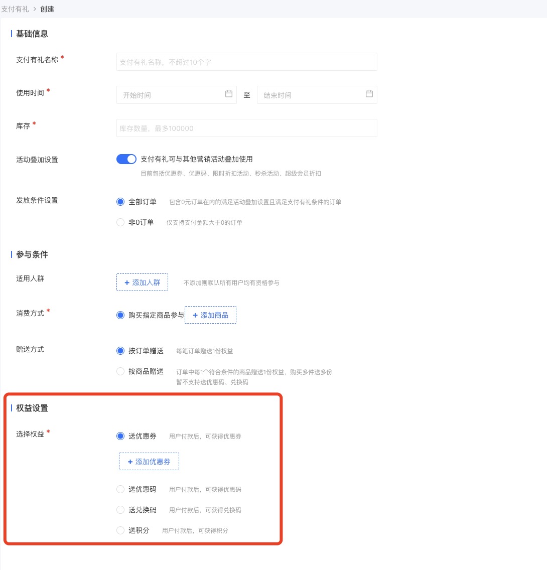 *注权益设置只能选择一项【优惠卷最多支持100个;优惠卷、优惠码只支持一个】