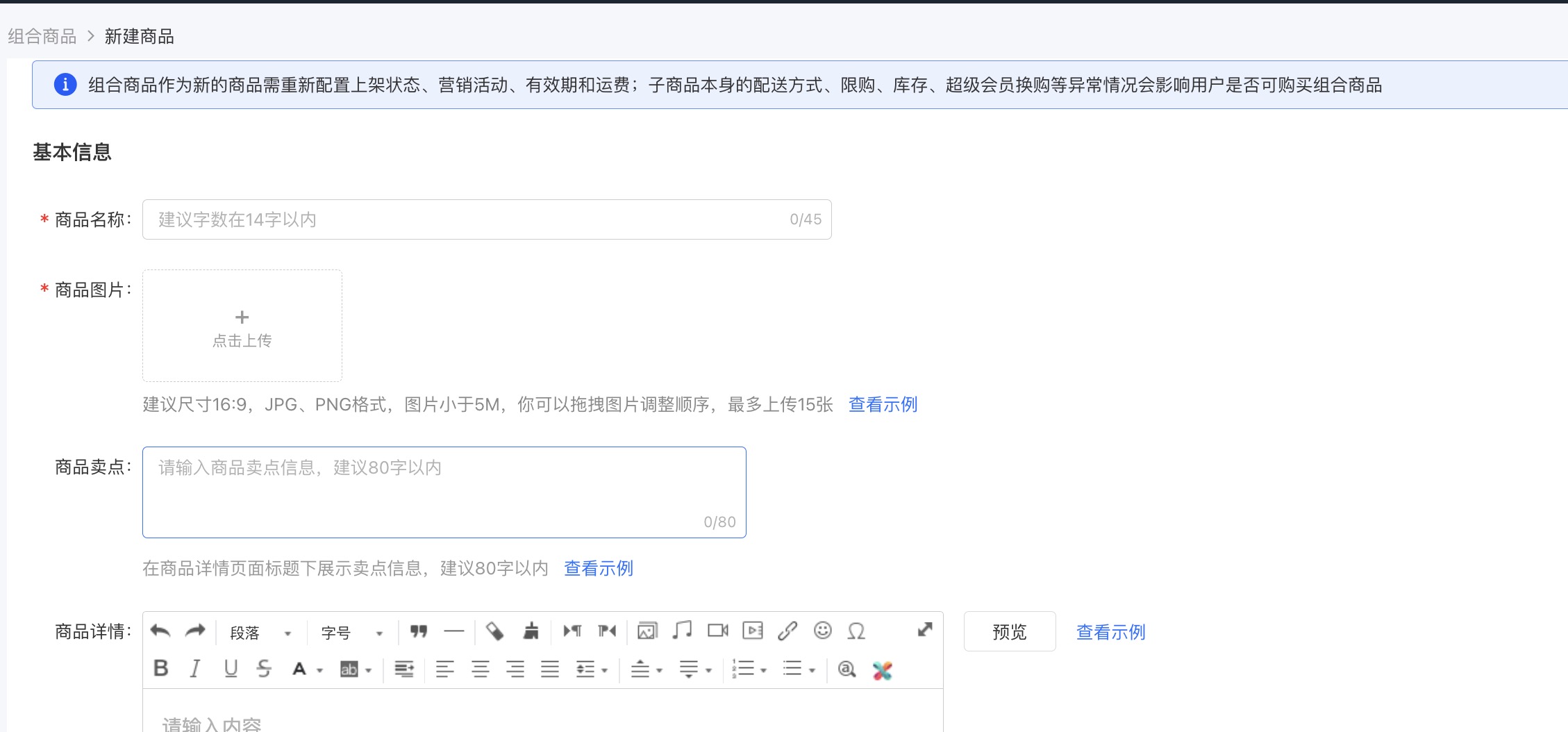 第一步 组合商品列表(商品管理)点击新建——(模块一:基本信息,也是C端进入组合商品页面的样式)