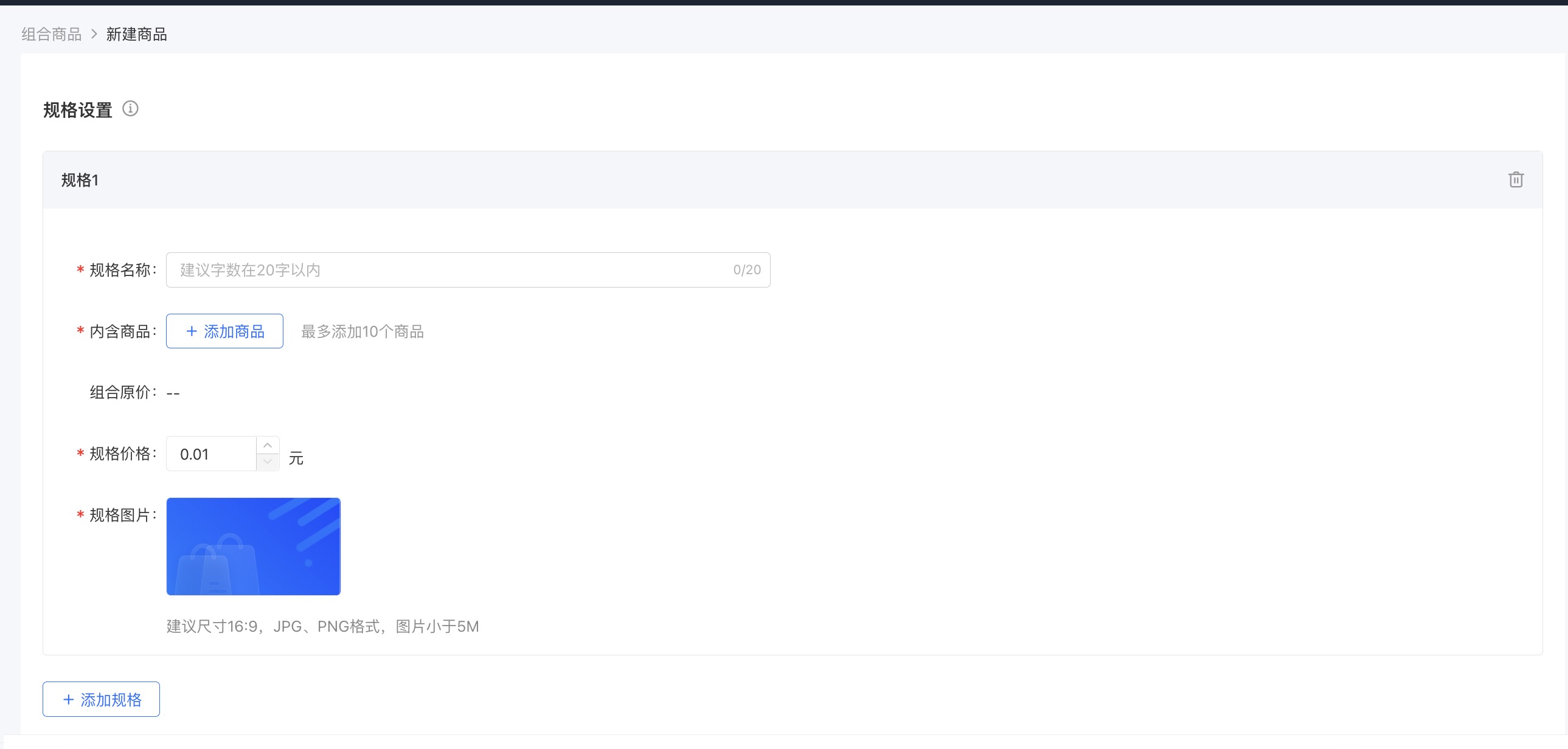 一个组合商品支持10个规格,每个规格内支持添加10个商品