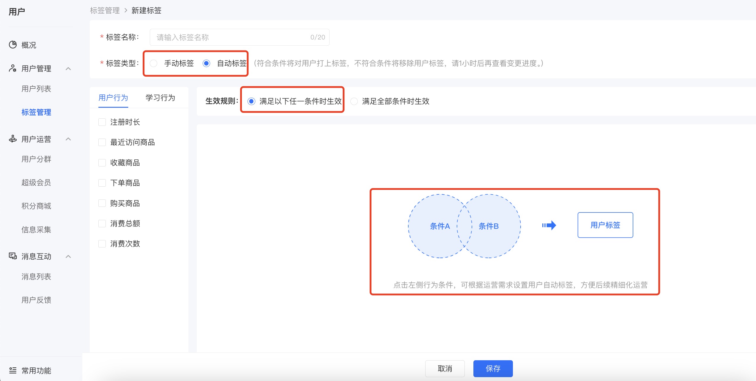 (1)满足以下任一条件时生效:当添加了多个标签筛选条件时,满足其中任意一个筛选条件的用户都会被贴上该标签。