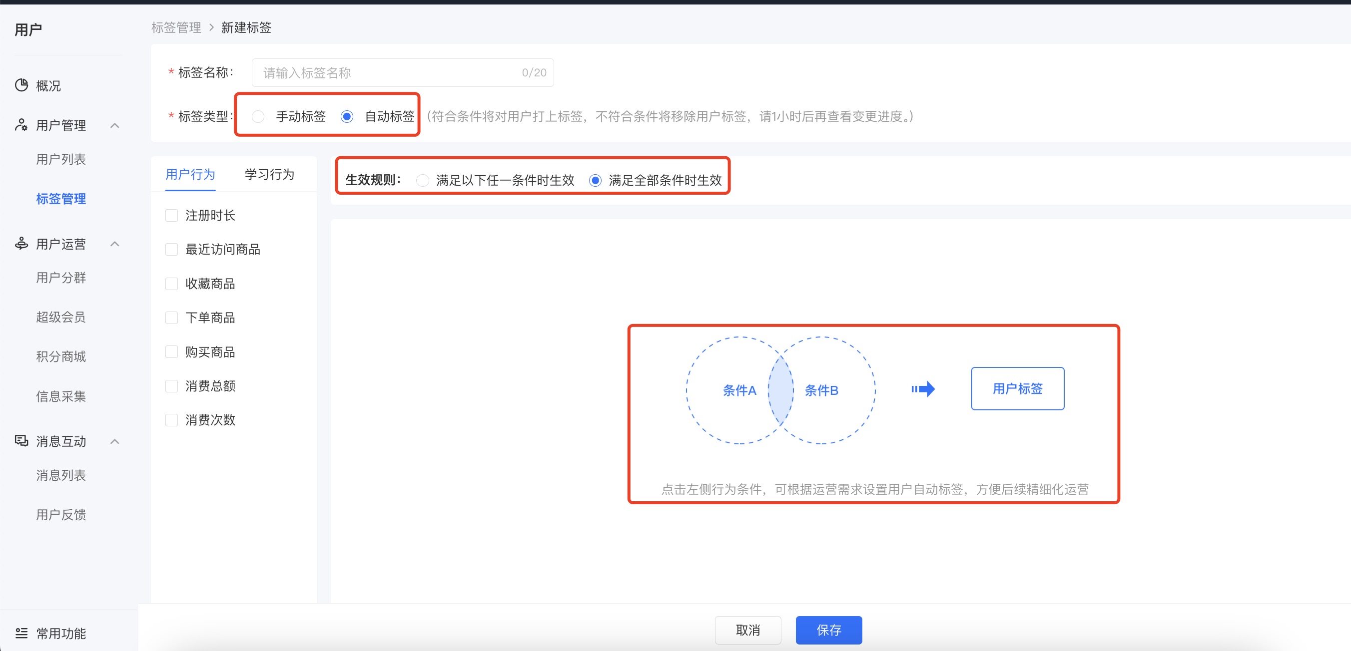 【自动标签】指的是商家提前设置好标签筛选条件,当用户满足相关条件后,会被自动贴上对应的标签。